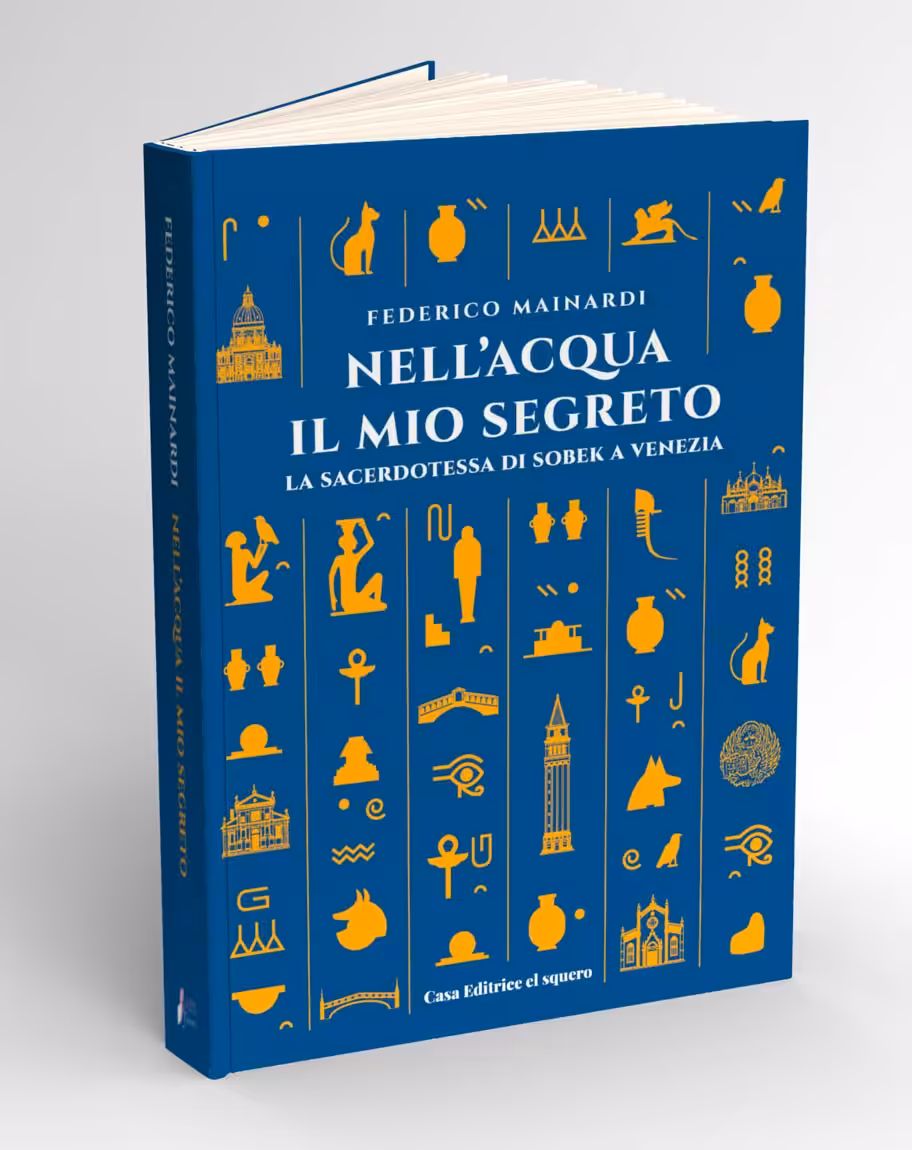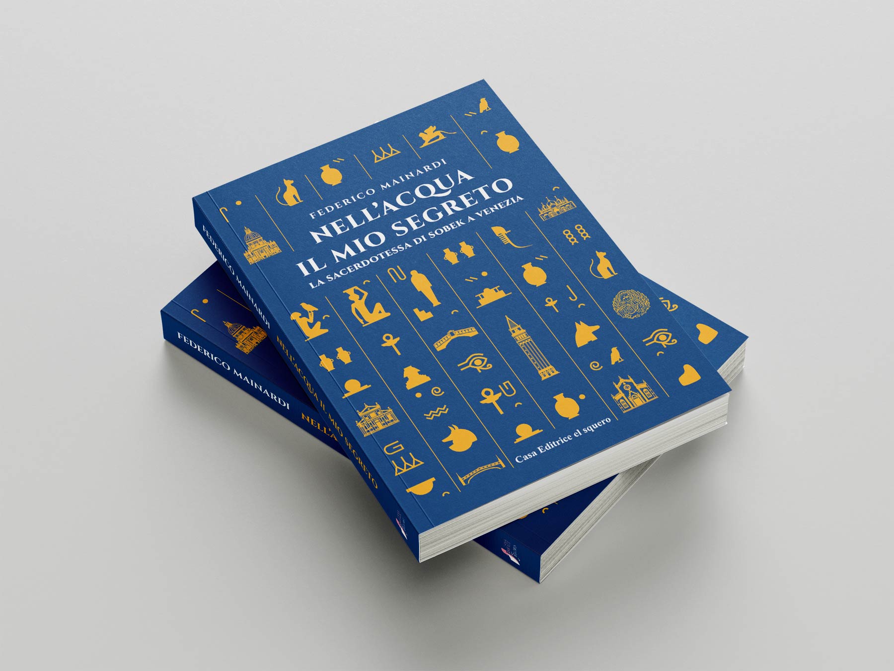 Facing the challenge of representing these diverse narratives on a single cover, the creative approach led to a synthesis of symbols and cultures. The idea of using hieroglyphics as a unifying element was a decision shared with the author. The cover features a papyrus adorned with traditional Egyptian hieroglyphs, but within them are hidden “fake” hieroglyphs depicting iconic monuments and symbols of Venice. This combination merges two different worlds into one artistic expression.