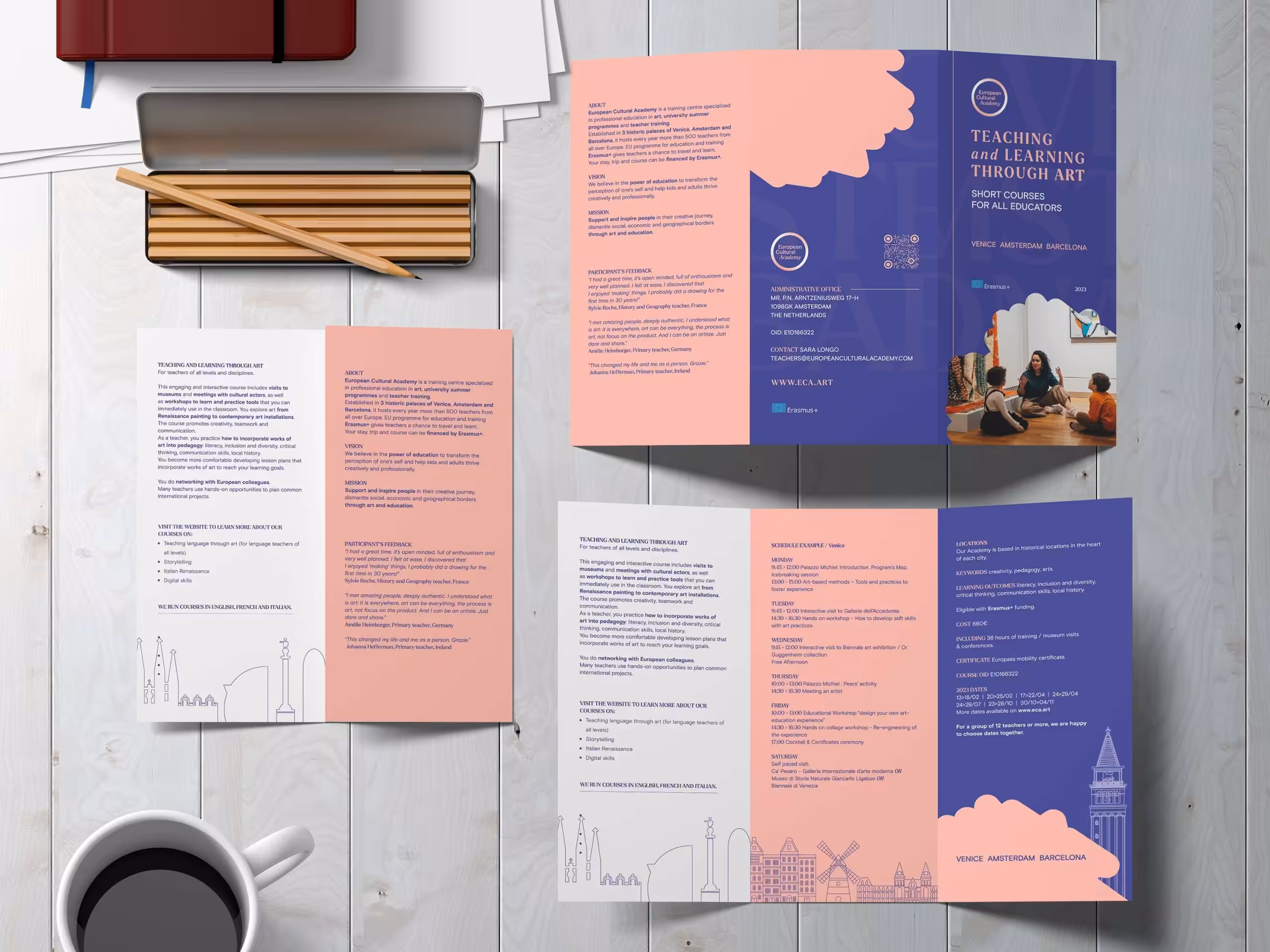 The creation of a three-panel brochure for the European Cultural Academy (ECA) represents a synergy between graphic design and effective communication. This work was conceived with the aim of illustrating short courses for teachers in the field of Art, held in three fascinating European cities: Amsterdam, Barcelona, and Venice. By merging the ECA guidelines with engaging design, the brochure captures the essence of a unique educational experience.