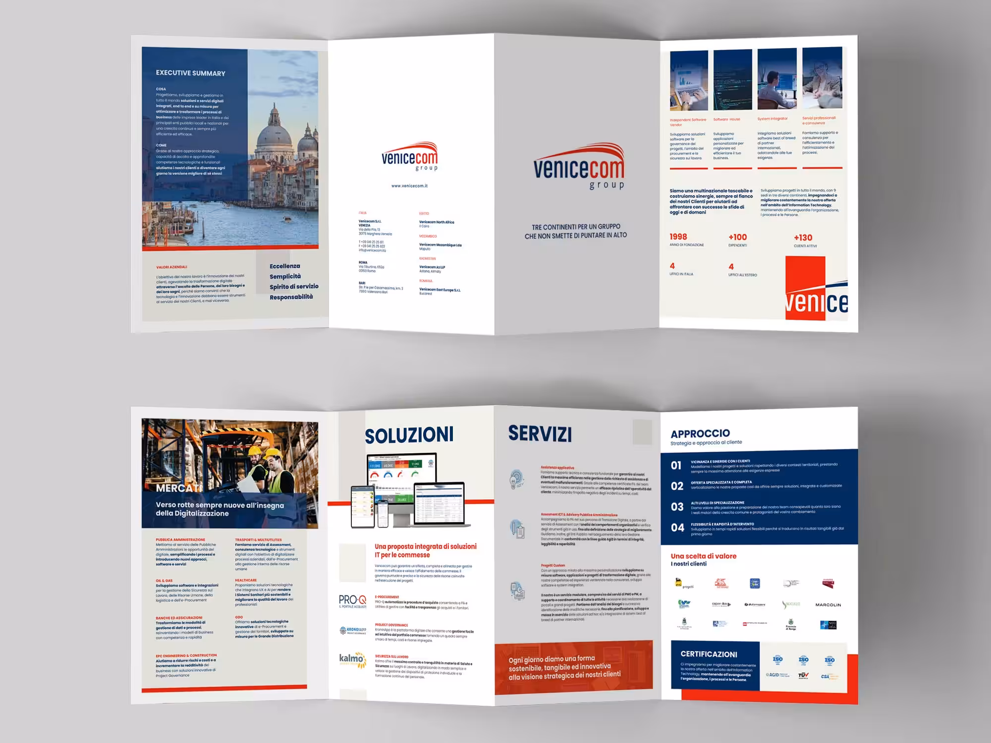 I had the opportunity to develop several brochures and leaflets with a less commercial and more technical approach for some of the leading companies in the sector. Among my recent projectss, I had the pleasure of closely collaborating with the Marketing Office of Venicecom, a renowned international group specializing in consulting and IT services, with five locations worldwide and its operational base in Venice Marghera, for which I also designed the new website.