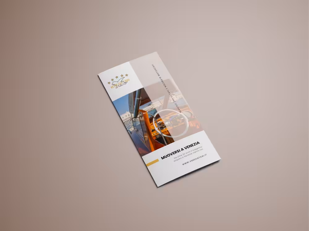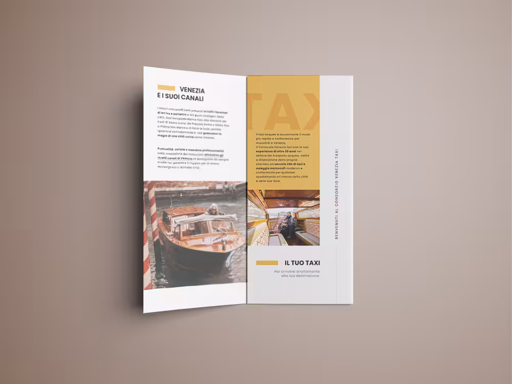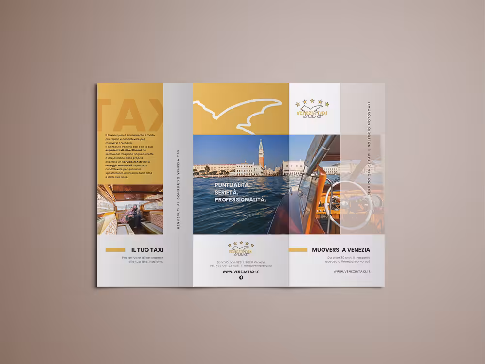 The Venezia Taxi brochure is not just an informational document; it aims to convey the brand identity of the company. Its clean, minimalist design communicates seriousness and professionalism, reflecting the modern and reliable image of Venezia Taxi. Every graphic element has been meticulously crafted to communicate the company’s values: efficiency, courtesy, and reliability.