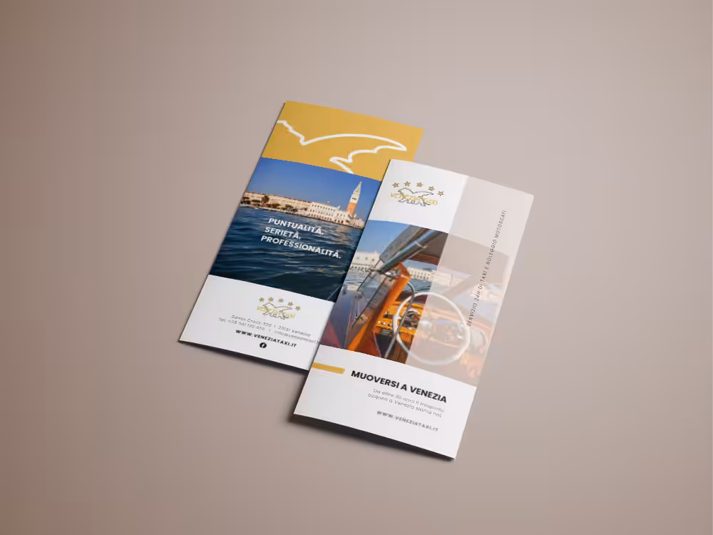 In the dynamic and fascinating landscape of the tourism sector, unique business realities emerge, offering distinctive services. In this context, my portfolio has expanded with a new project: the brochure created for Venezia Taxi. This tri-fold has been designed to present the Venezia Taxi Company in a refined and comprehensive manner at the prestigious BIT event in Milan, one of Europe’s major gatherings dedicated to the world of tourism.