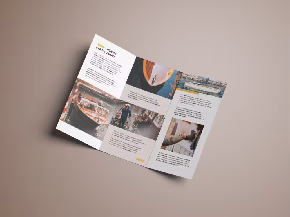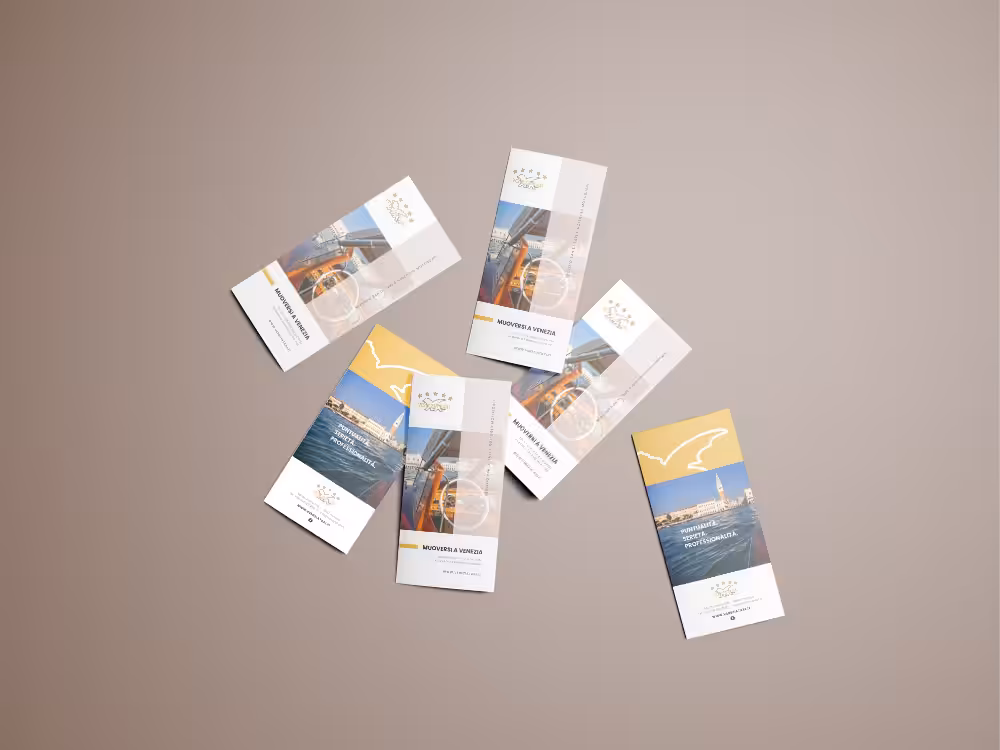 Visitors to the BIT event in Milan had the opportunity to immerse themselves in a harmonious visual universe, where each element contributes to the best representation of Venezia Taxi’s services. The three panels of the brochure are organized to guide the reader through a comprehensive overview of the company and its distinctive services. From organizing guided tours to the flexibility in meeting customer needs, every aspect is presented clearly and exhaustively. The skillful use of white space and evocative images creates a visual balance that makes for a pleasant and engaging reading experience.