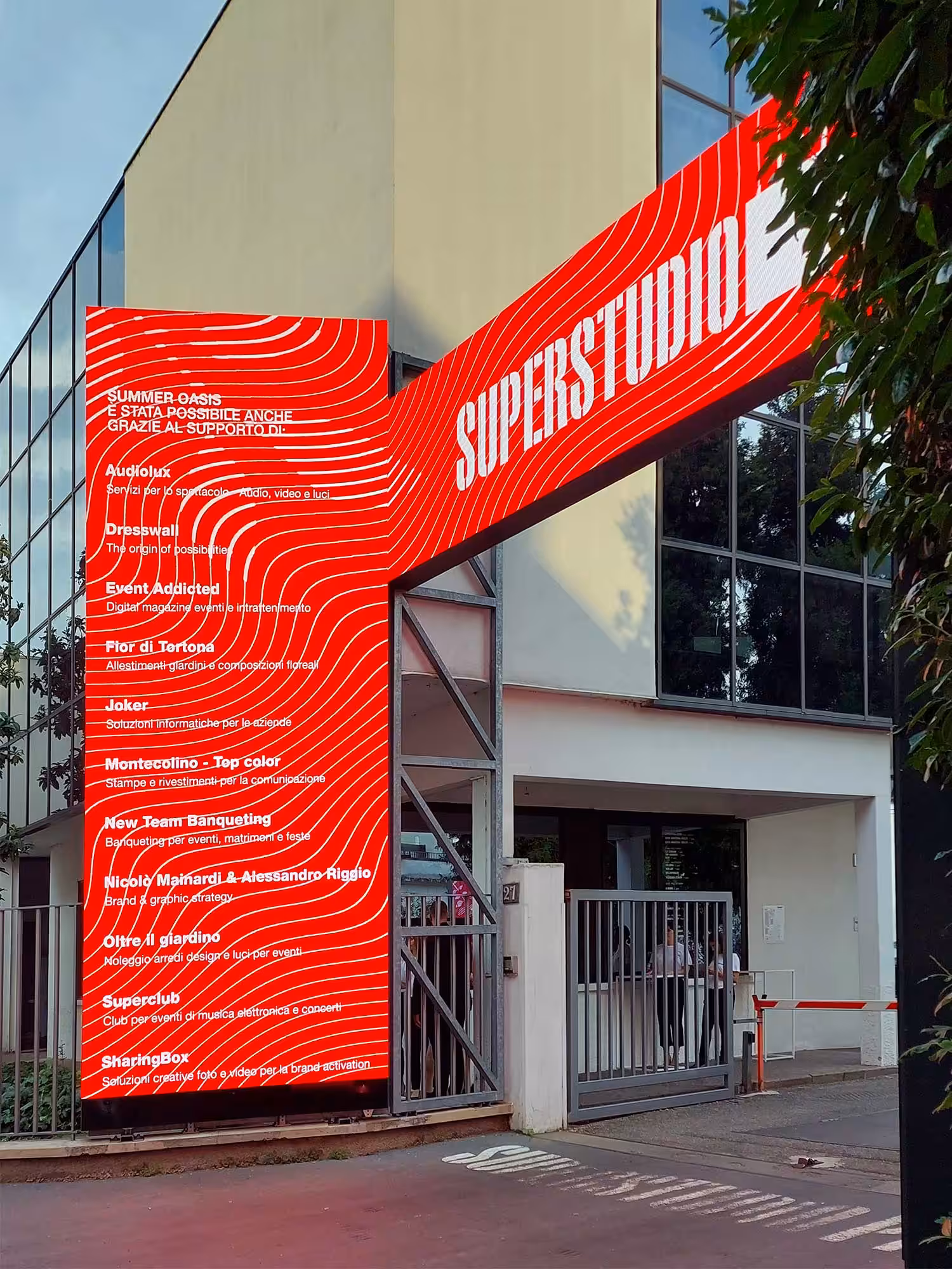The decision to use soft lines evoking the movement of both waves and dunes was a shared idea with Superstudio and Alessandro, who appreciated the concept. This design captured the essence of freshness and the atmosphere of an oasis, providing a fascinating contrast to the “rigidity” of Superstudio’s square brand identity. This choice acted as a mediation to balance the brand’s identity with the event’s theme.