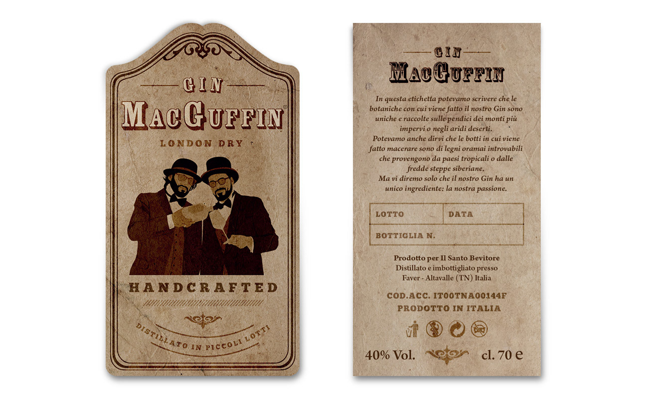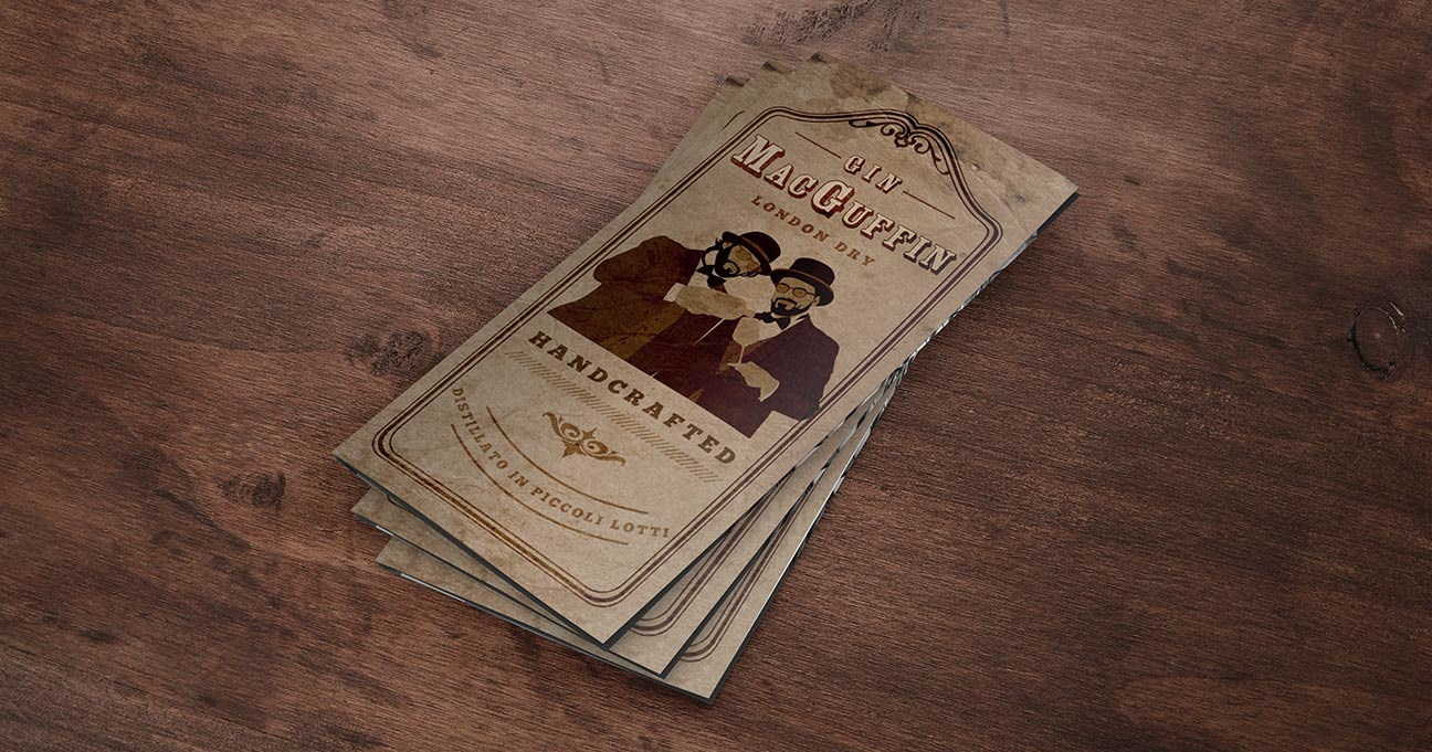 La mia collaborazione ha riguardato principalmente la creazione dell’etichetta e del materiale di comunicazione per stand e fiere, oltre a vari elementi di branding che avrebbero reso unica l’esperienza legata al Gin MacGuffin. Questo gin è nato dalla passione e dalla creatività di due amici, Angelo (de “Il Santo Bevitore” – qui è possibile visitare il sito) e Francesco, che desideravano che la grafica dell’etichetta riflettesse un’atmosfera avventurosa e affascinante, quasi da vecchio West. Volevano evocare l’immagine di due distillatori che viaggiano e vendono il loro magico tonico, proprio come i protagonisti di una storia epica.