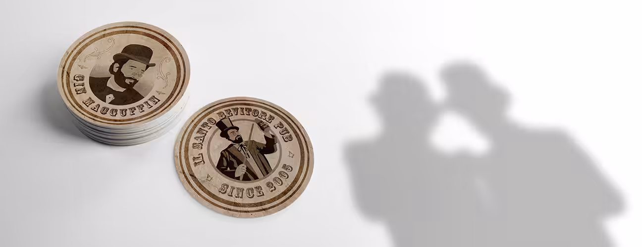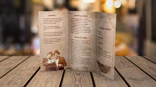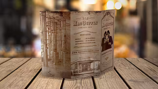 Oltre all’etichetta, ho creato il materiale di comunicazione per gli stand e le fiere, compresi i pieghevoli e i sottobicchieri. Tutti questi elementi hanno mantenuto lo stile old-west, trasportando il pubblico in un viaggio nel tempo attraverso il mondo del Gin MacGuffin.