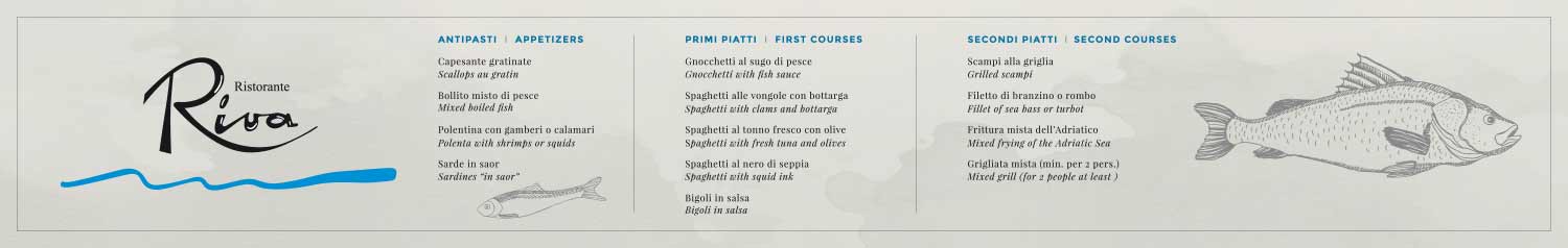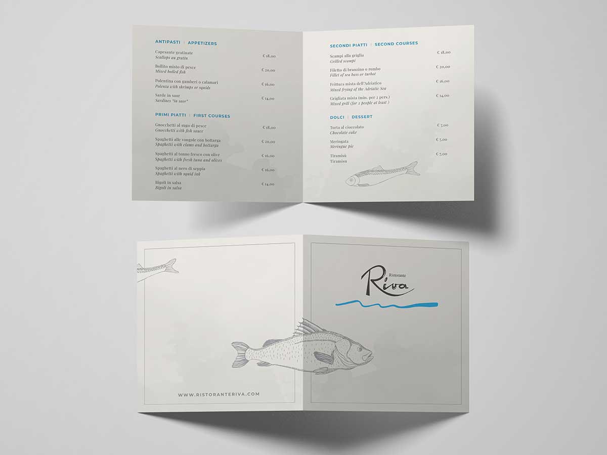 Nel 2020 ho avuto l’opportunità di collaborare con il Ristorante Riva in un progetto di graphic design che ha dato vita a un’identità visiva divertente e allo stesso tempo elegante. L’obiettivo principale era trasmettere l’atmosfera raffinata e la specialità di pesce del ristorante attraverso una serie di materiali grafici accuratamente studiati.