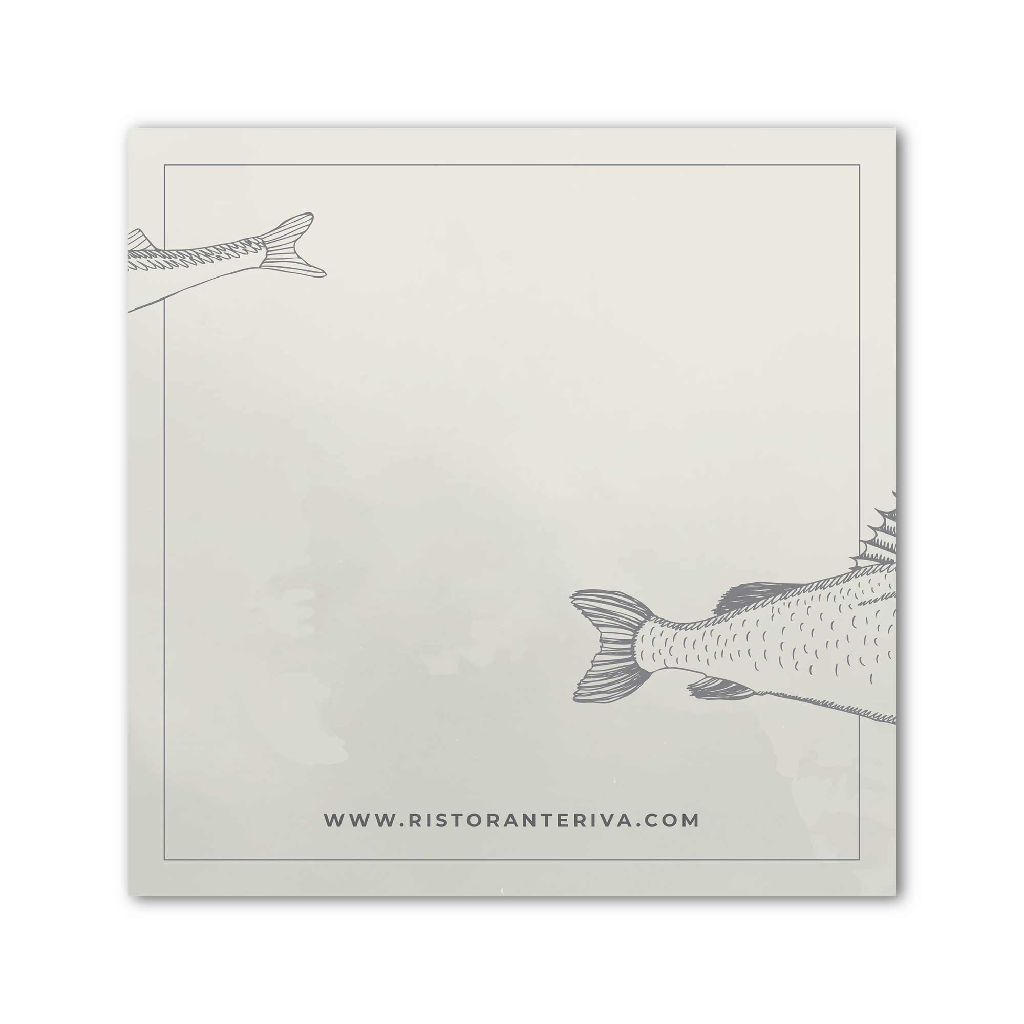 La mia proposta per il menu è stata caratterizzata da un formato quadrato, dove la parte anteriore del pesce era posizionata davanti, mentre il retro mostrava la parte posteriore. Questa scelta aveva uno scopo: tenendo il menu aperto, emergeva un’immagine armonica e completa. Questa idea si è estesa al biglietto da visita, che ha ripreso il concetto, creando una continuità visiva tra i diversi materiali.