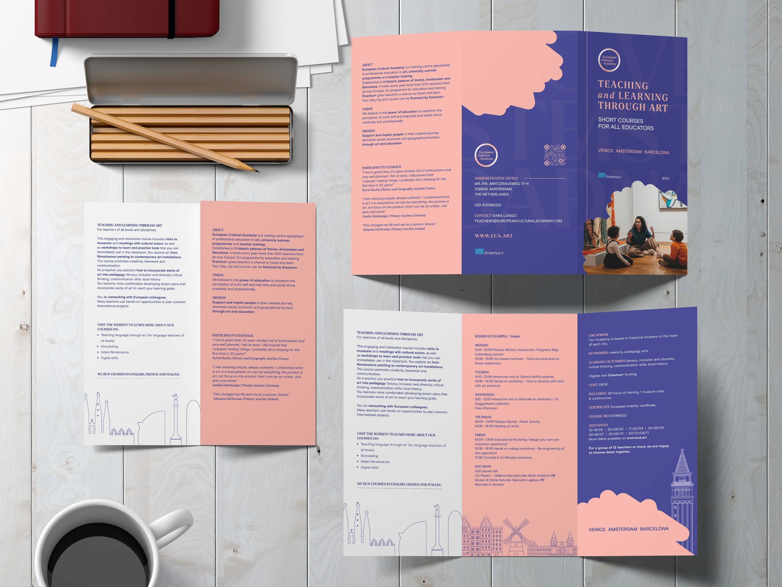 La creazione di un pieghevole a tre ante per l’European Cultural Academy (ECA) rappresenta una sinergia tra graphic design e comunicazione efficace. Questa lavoro è stata concepito con l’obiettivo di illustrare i corsi brevi per insegnanti nel campo dell’Arte, tenuti in tre affascinanti città europee: Amsterdam, Barcellona e Venezia. Attraverso la fusione delle guidelines dell’ECA con una progettazione accattivante, il pieghevole cattura l’essenza di un’esperienza formativa unica.