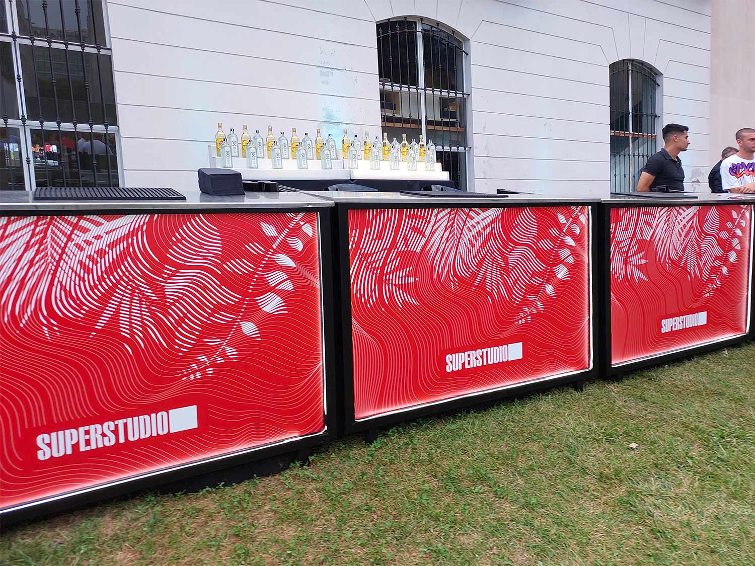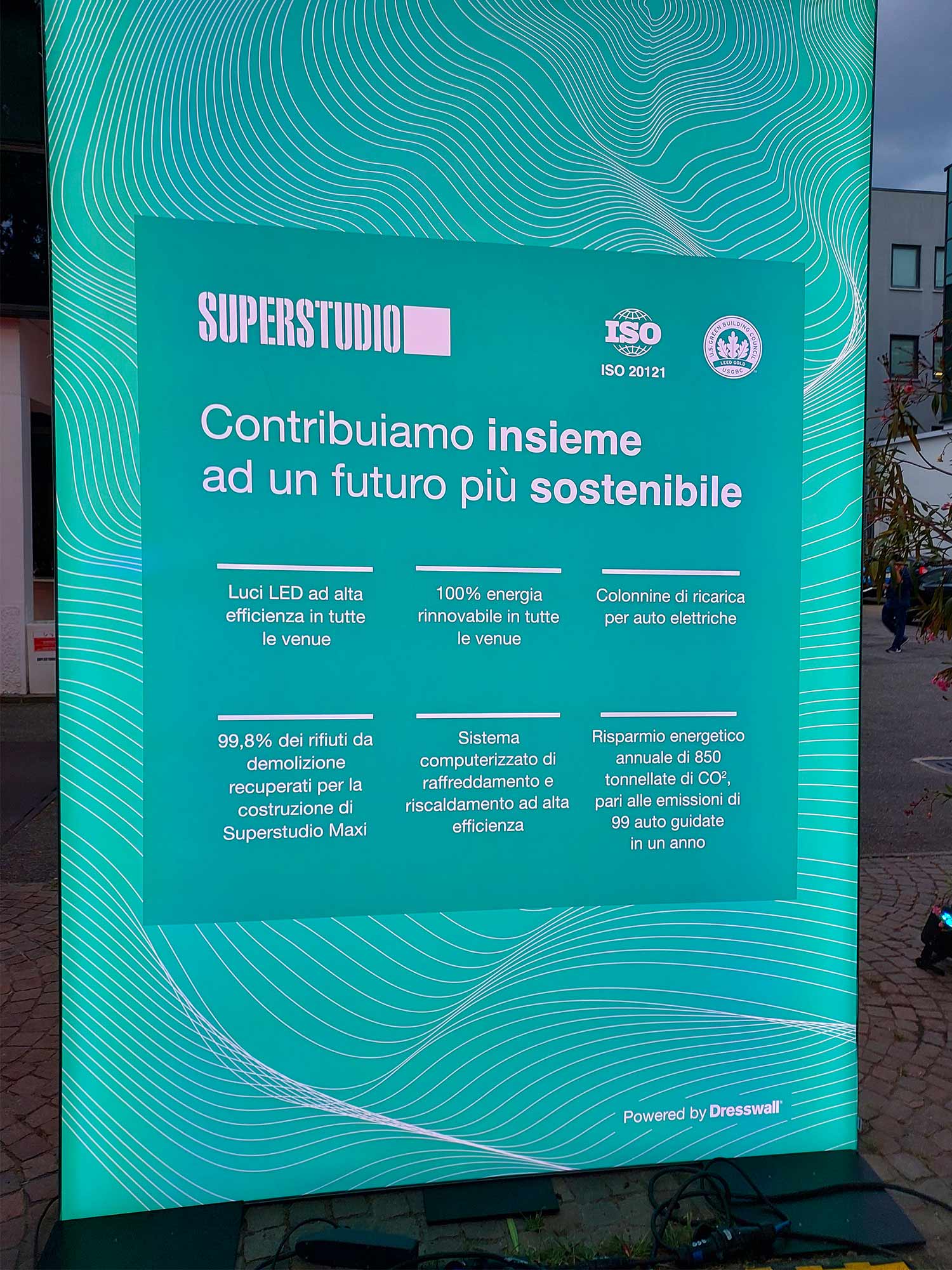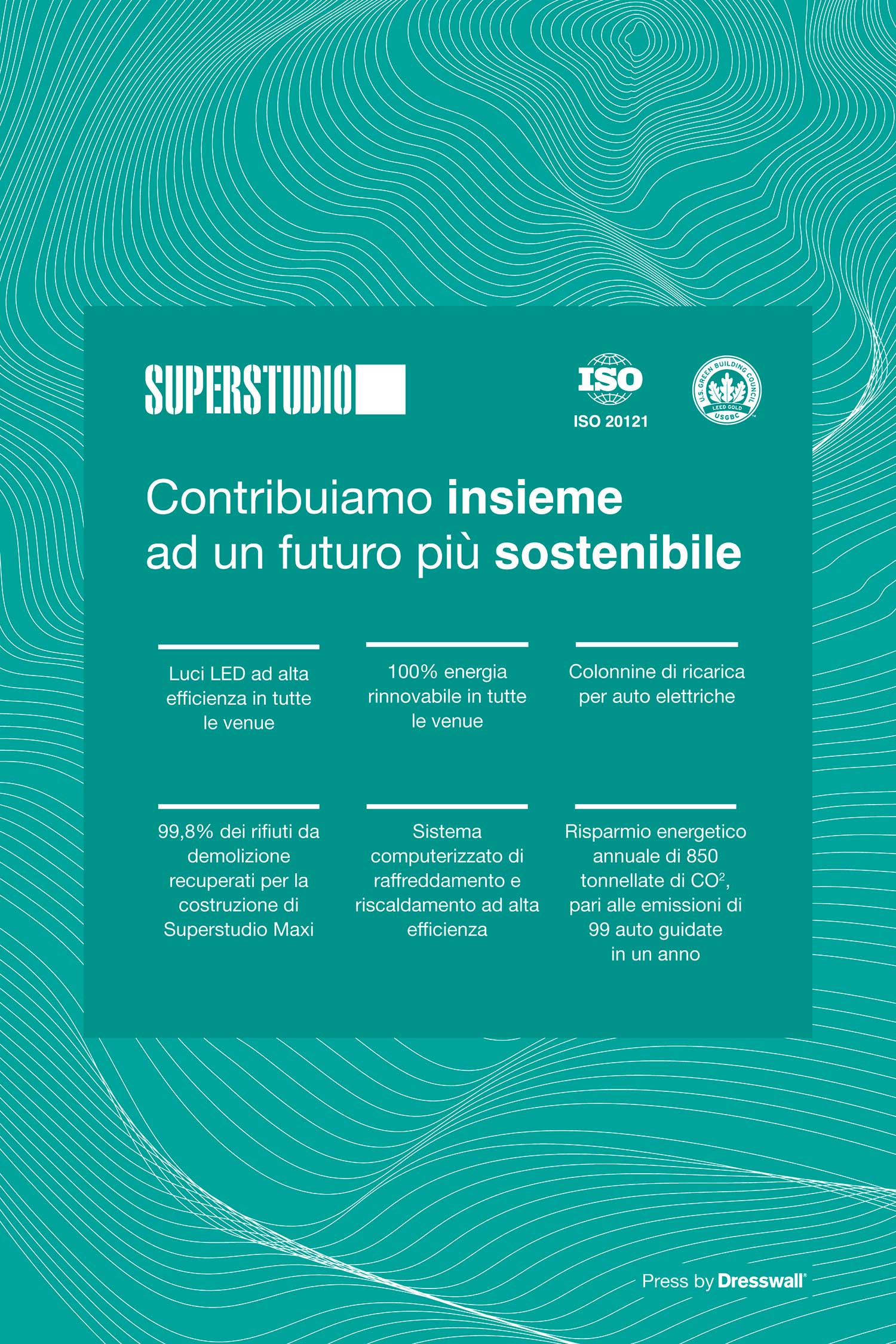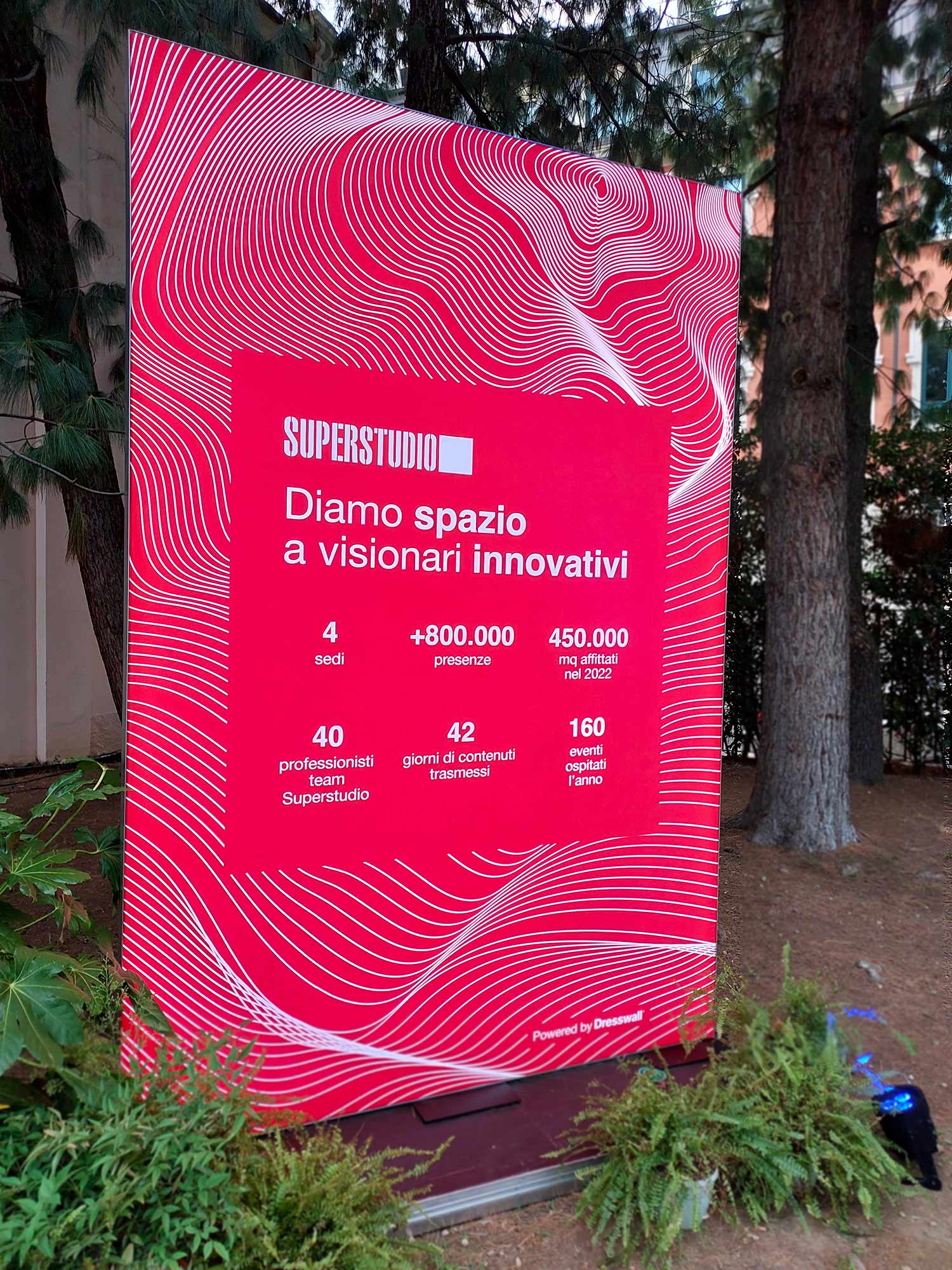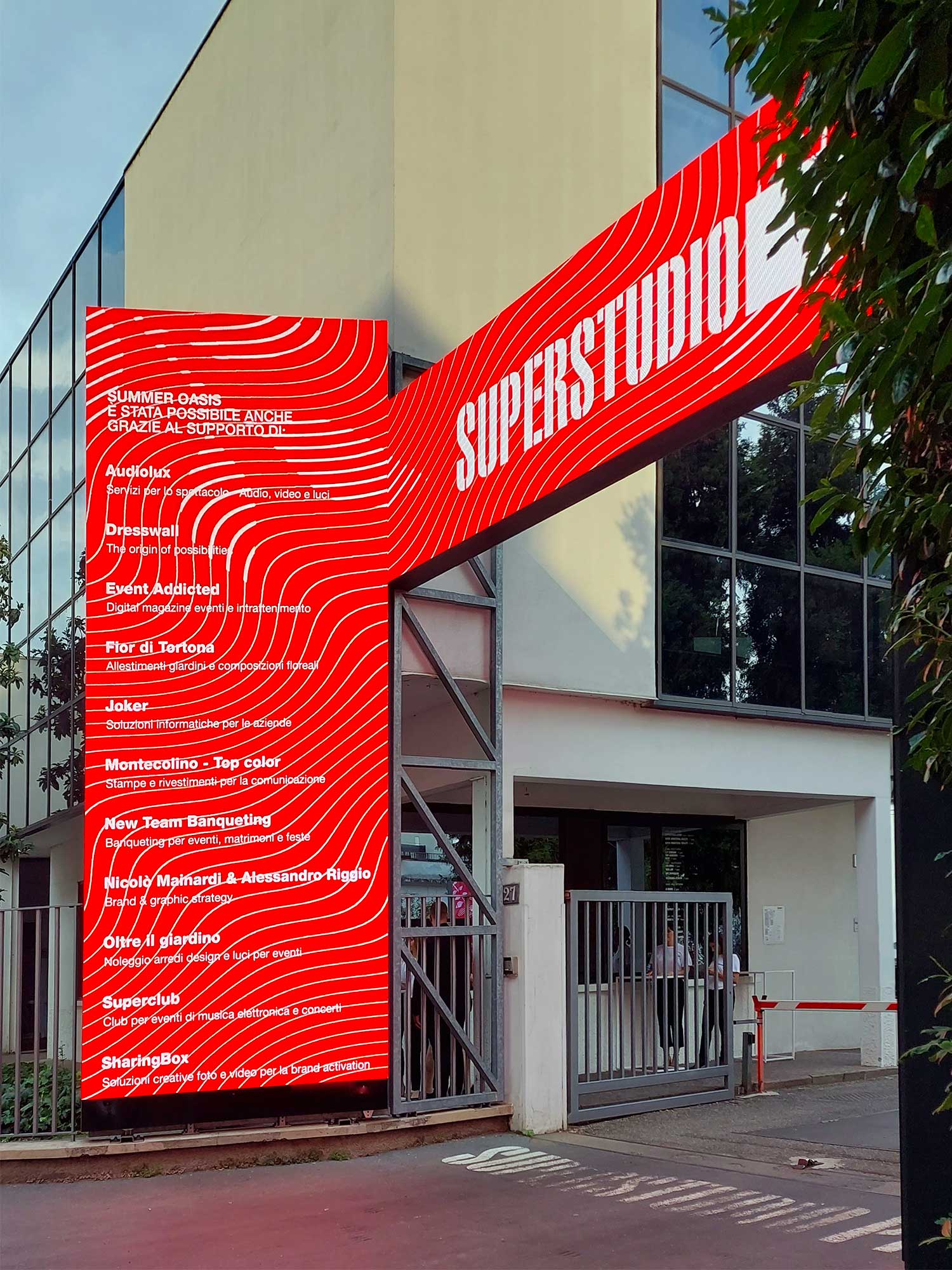 La scelta di utilizzare linee morbide che evocano il movimento sia delle onde che delle dune è stata un’idea condivisa con Superstudio e Alessandro che hanno apprezzato il concept. Questo design ha saputo catturare l’essenza della freschezza e dell’atmosfera di un’oasi, offrendo un contrasto affascinante con la “rigidità” del marchio quadrato di Superstudio. Questa scelta è stata una sorta di mediazione per cercare di equilibrare l’identità del marchio con il tema dell’evento.